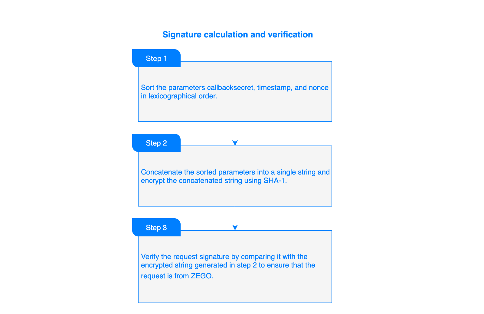 To ensure system security, you must authenticate every callback request sent from the ZEGO server to your application server. You can verify the callback request by comparing the signature included in the request with the locally calculated signature.